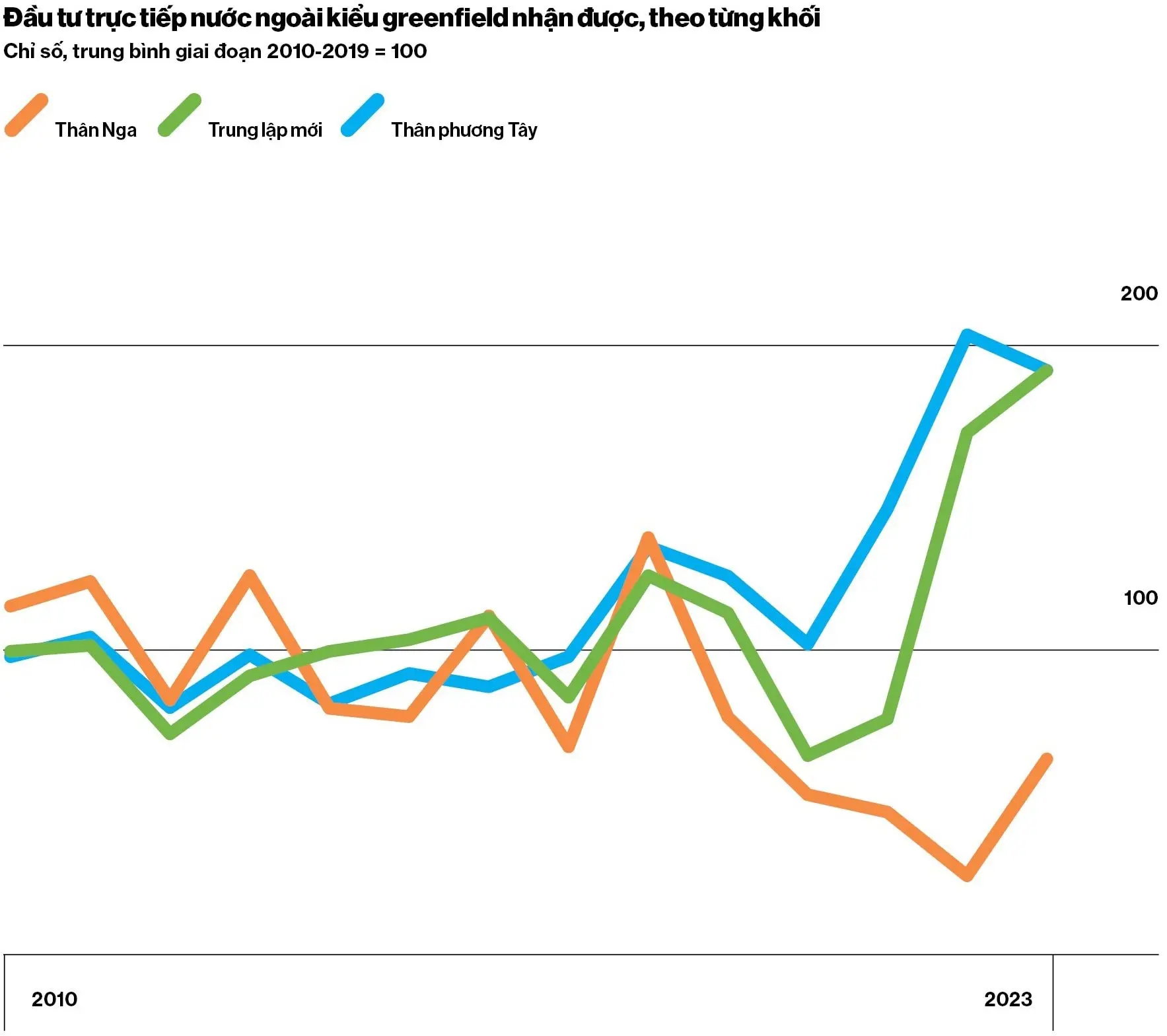 Có một cách quan trọng mà nhóm Trung lập mới đang hưởng lợi từ việc giữ mình trung lập: Họ đang thu hút ngày càng nhiều vốn đầu tư từ các công ty nước ngoài vào các nhà máy và dự án mới (hay còn gọi là đầu tư trực tiếp nước ngoài kiểu “greenfield”). Một trong những yếu tố thúc đẩy xu hướng này là các doanh nghiệp Trung Quốc tăng cường đầu tư xây dựng nhà máy ở các quốc gia khác để né tránh thuế nhập khẩu và các biện pháp bảo hộ từ Mỹ và liên minh châu Âu.